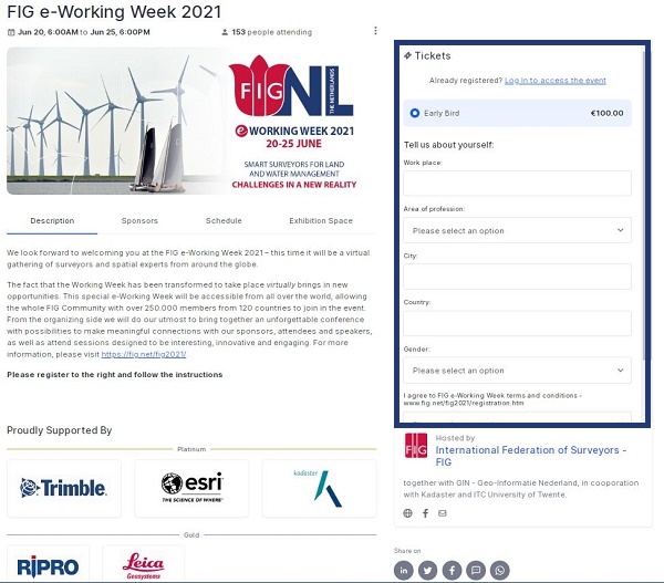 Registered for the FIG Working Week 2020? If you registered and paid last year, your registration has been moved to the FIG e-Working Week and Hopin.