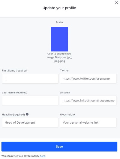 When you first create a Hopin account, you will be prompted to fill out your profile information. This account needs to be filled out to join an event.